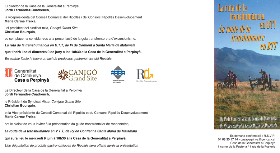 J'ai le plaisir de vous faire parvenir en pièce jointe une invitation pour assister à la présentation du guide transfrontalier de randonnées en VTT entre le Conflent, le Vallespir, et le Ripollès. La manifestation aura lieu ce mercredi 9 juin à 18h30 à la Casa de la Generalitat de Catalunya a Perpignan. Après la présentation, il y aura une dégustation de produits du terroir de la zone concernée.
